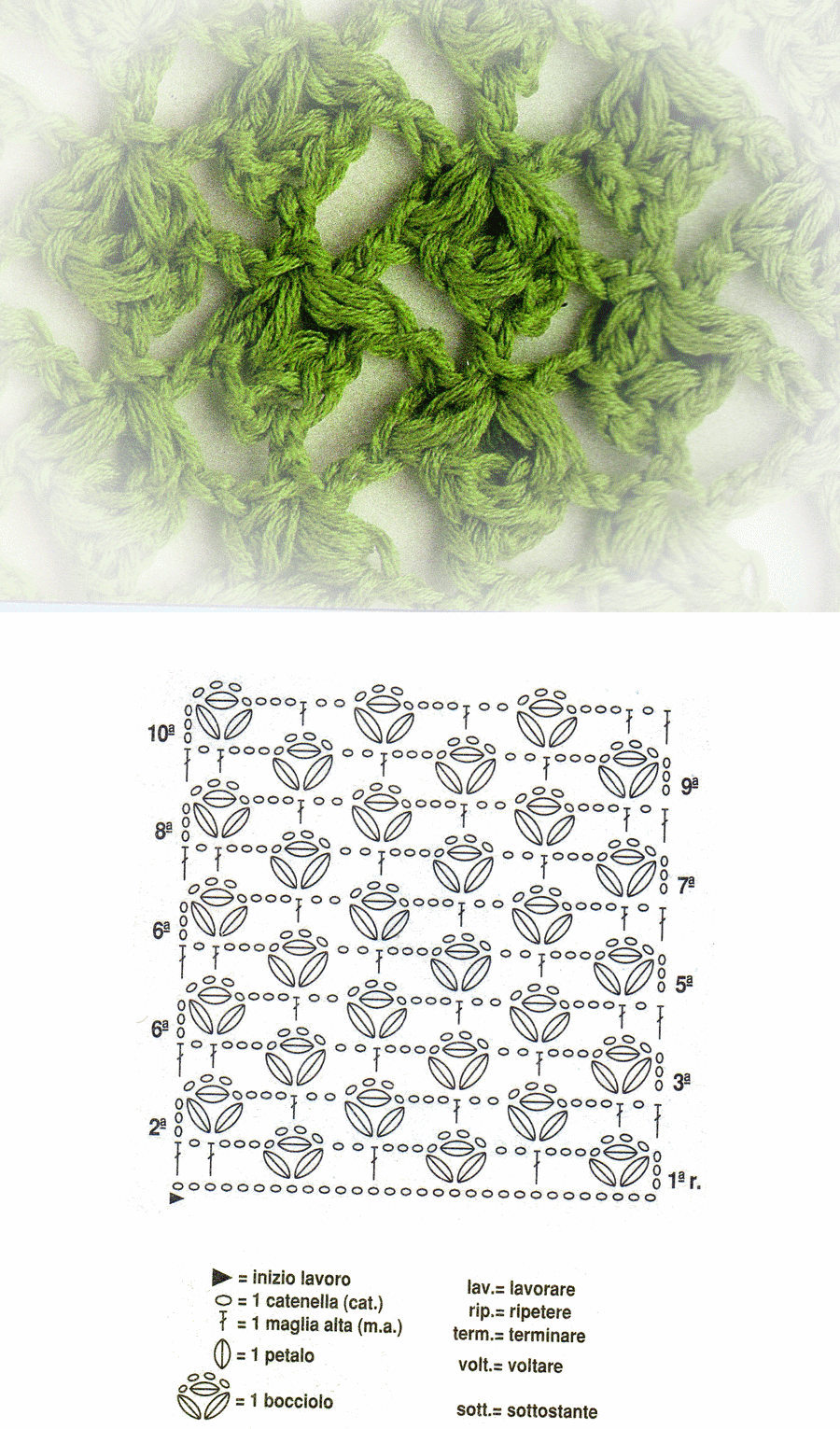 cat. (= 1 m. a.), saltare 1 cat., nella m. a. seguente lav. * 1 bocciolo, 3